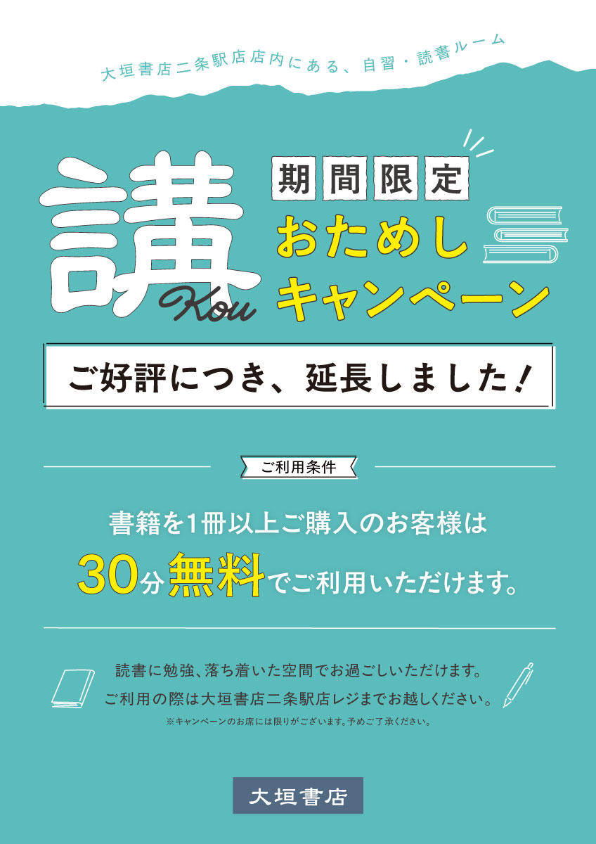書籍1冊以上ご購入で、有料自習・読書スペース「講」を30分無料でご利用いただけます。(当日のみ)
