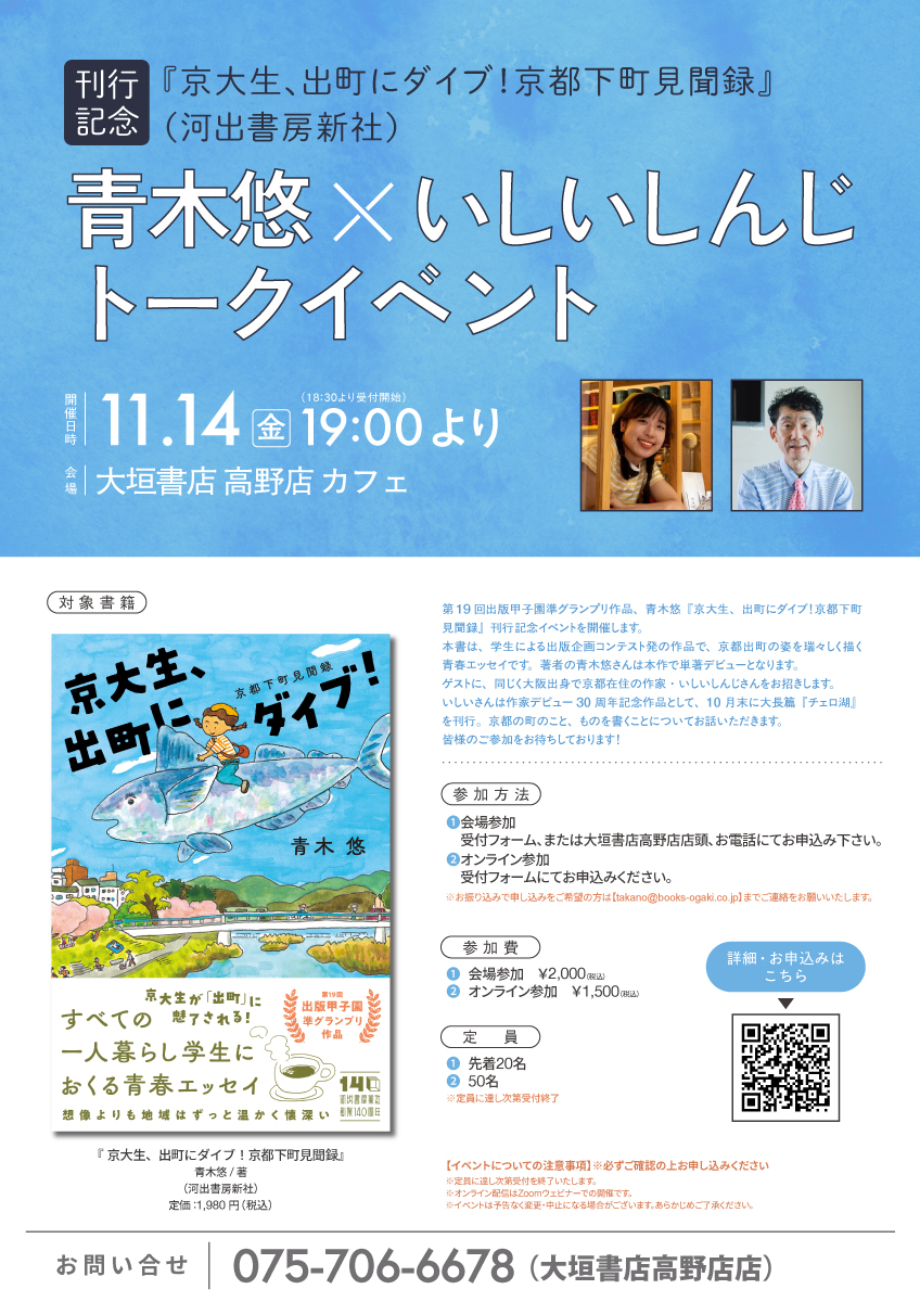 2025年10月20日第19回出版甲子園準グランプリ作品、青木悠『京大生、出町にダイブ! 京都下町見聞録』刊行記念イベントを開催します。