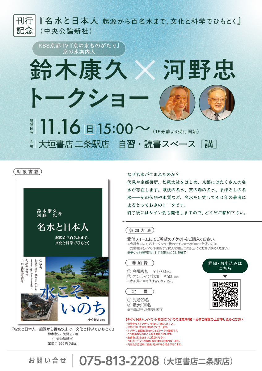 歌枕の名水、茶の湯の名水、まぼろしの名水――その伝説や水質など、名水を研究して40年の著者によるとっておきのトークです。