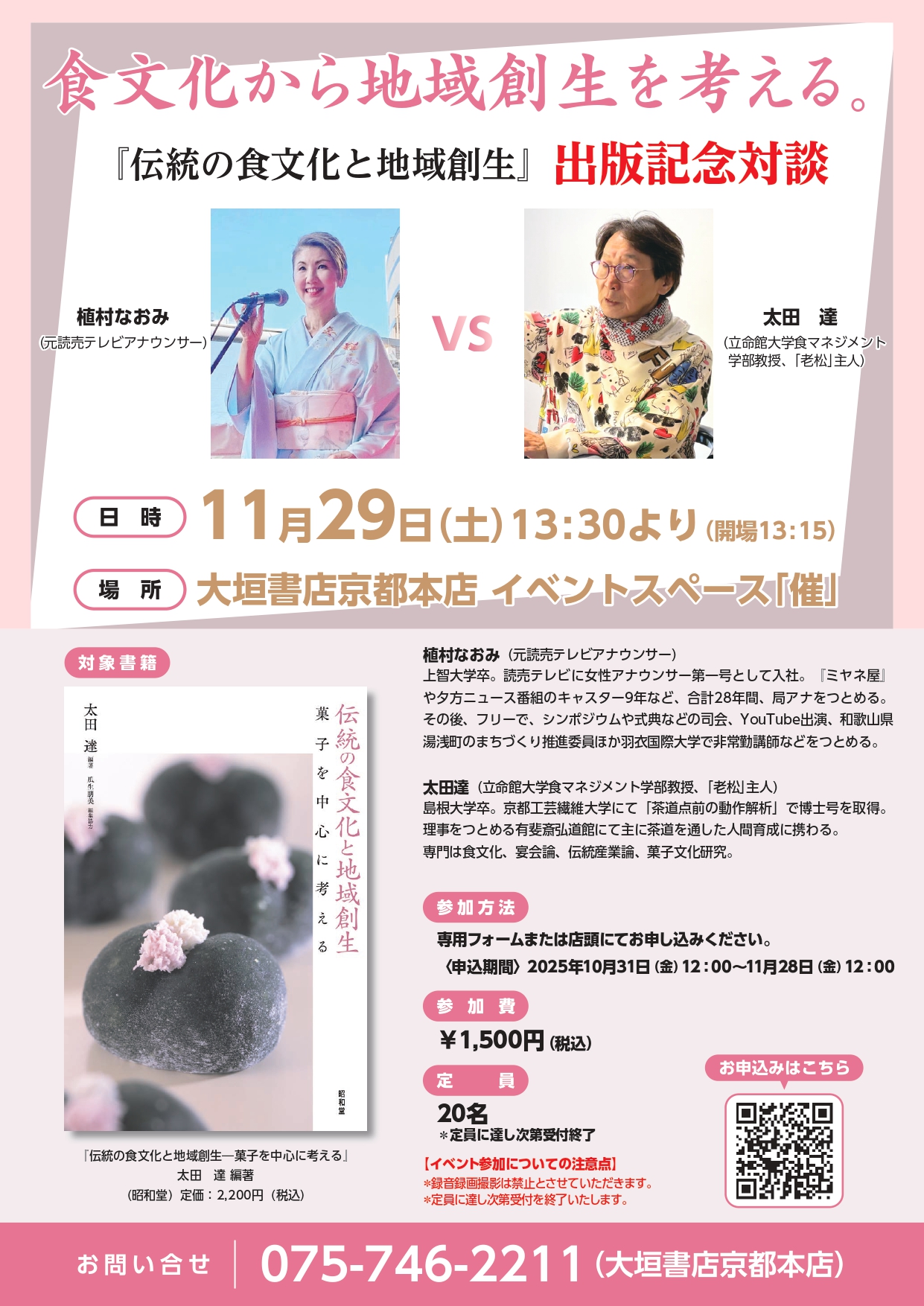 2025年10月31日『伝統の食文化と地域創生』(昭和堂)の出版を記念して、大垣書店京都本店で植村なおみさん(元読売テレビアナウンサー)、太田達さん(立命館大学食マネジメント学部教授、「老松」主人)の対談トークイベントを開催いたします。
