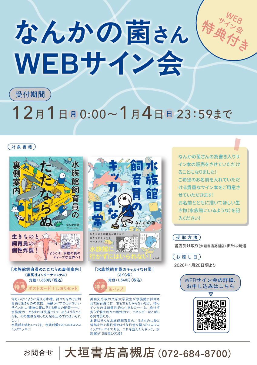 2025年11月30日『水族館飼育員のただならぬ裏側案内』(集英社インターナショナル)『水族館飼育員のキッカイな日常』(さくら舎)の著者・なんかの菌さんの為書き入りサイン本の販売をさせていただけることになりました!ご希望のお名前(お宛名)を入れていただける貴重なサイン本をご用意させていただきます!お名前とともに描いてほしい生き物(水族館にいるような)を記入ください。