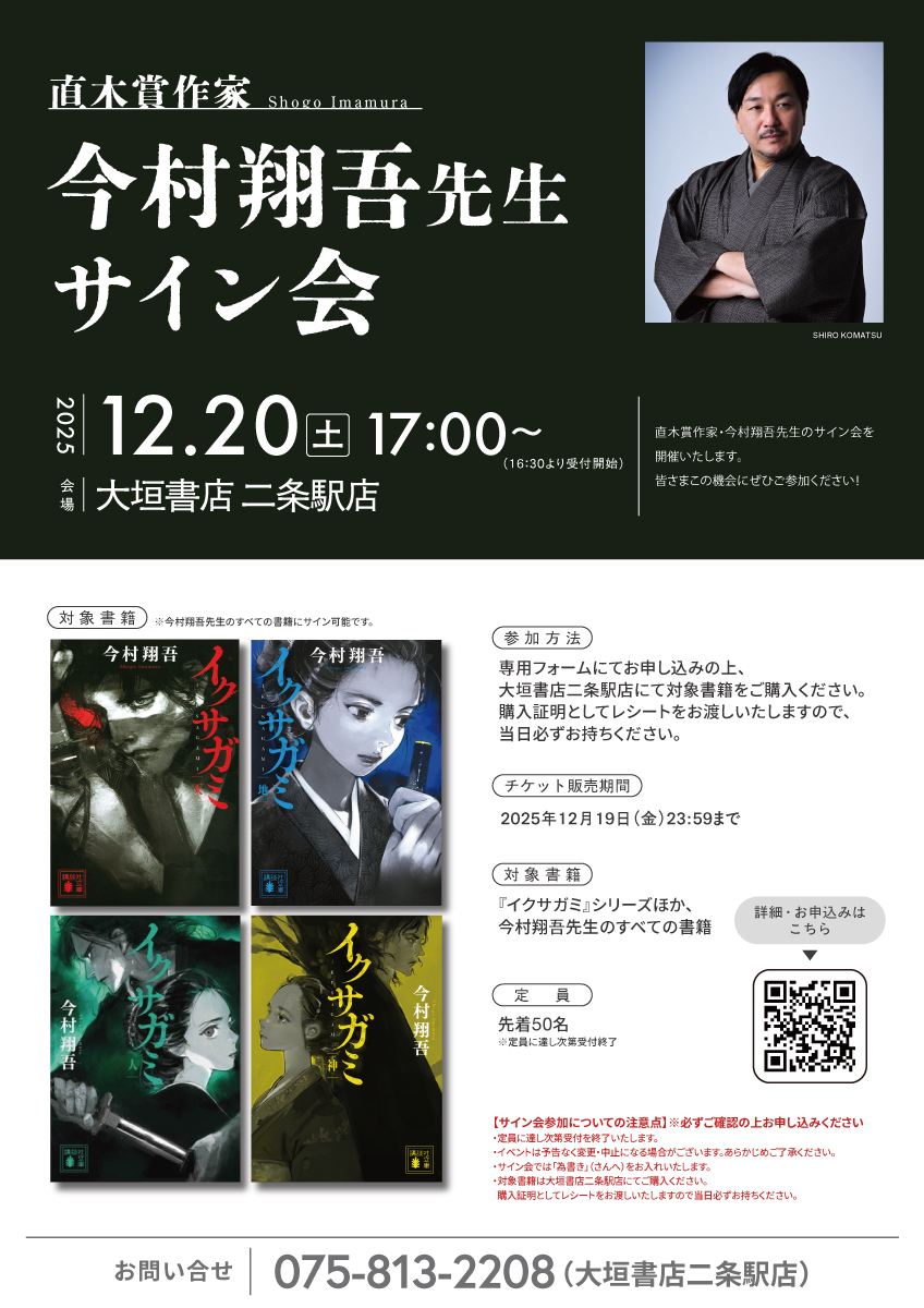 2025年12月11日直木賞作家・今村翔吾先生のサイン会を開催いたします。皆さまこの機会にぜひご参加ください!