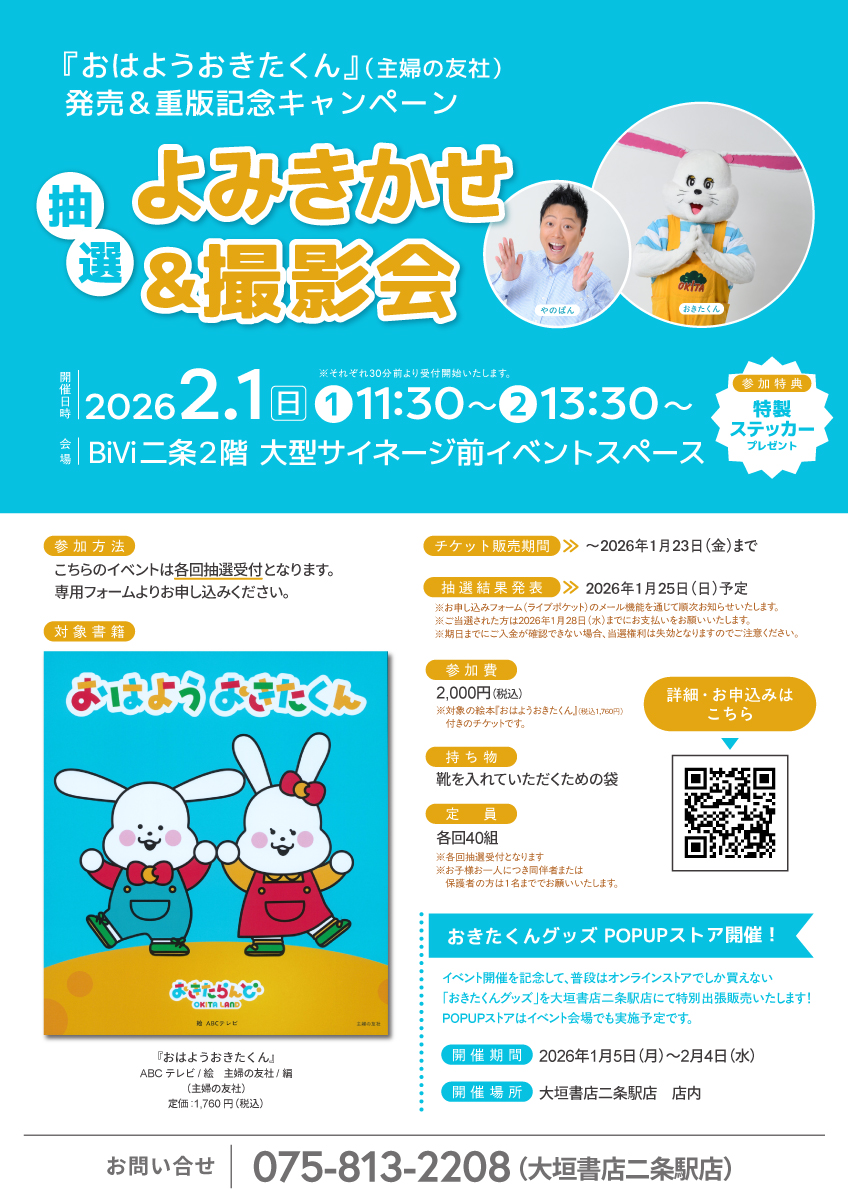 また、イベント開催記念といたしまして、普段はオンラインストアでしか買えない「おきたくんグッズ」を大垣書店二条駅店にて特別出張販売いたします!POPUPストアはイベント会場でも実施予定です。