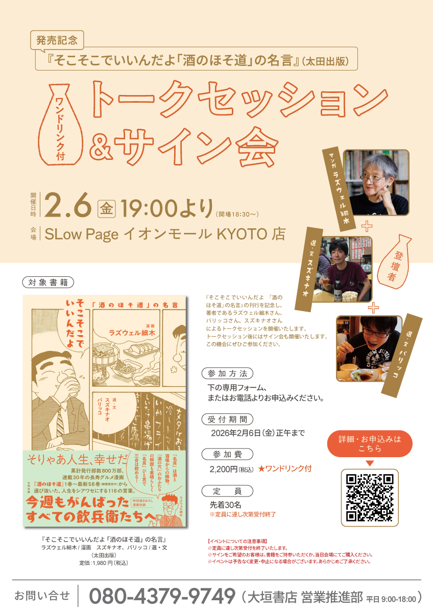 2026年1月20日『そこそこでいいんだよ 「酒のほそ道」の名言』の刊行を記念し、著者であるラズウェル細木さん、パリッコさん、スズキナオさんによるトークセッションを開催いたします。トークセッション後にはサイン会も開催いたします。この機会にぜひご参加ください。