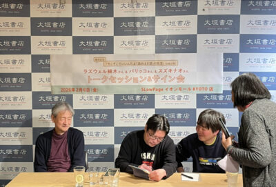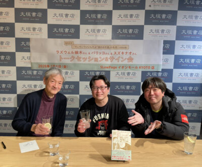 2026年2月7日2026年2月6日(金)SLowPageイオンモールKYOTO店にて、『そこそこでいいんだよ 「酒のほそ道」の名言』発売記念した、ラズウェル細木さん、パリッコさん、スズキナオさんによるトークセッションを開催いたしました。
