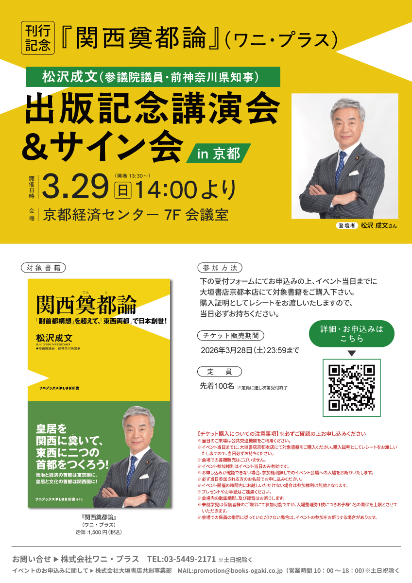 【3/29(日)開催】『関西奠都論』(ワニ・プラス)刊行記念 出版記念講演会&サイン会 in 京都 開催のお知らせ
