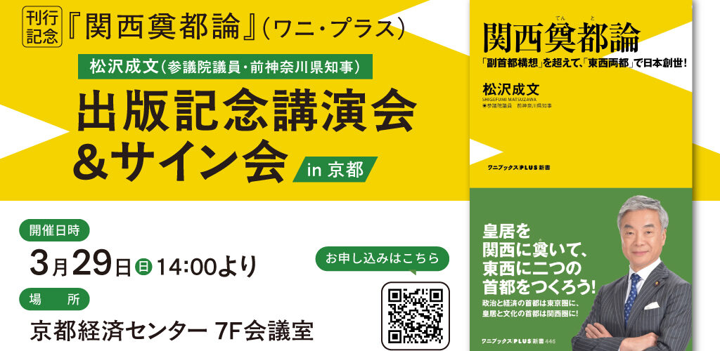 『関西奠都論』(ワニ・プラス)の刊行を記念して、 松 … 続きを読む 【3/29(日)開催】『関西奠都論』(ワニ・プラス)刊行記念 出版記念講演会&サイン会 in 京都 開催のお知らせ