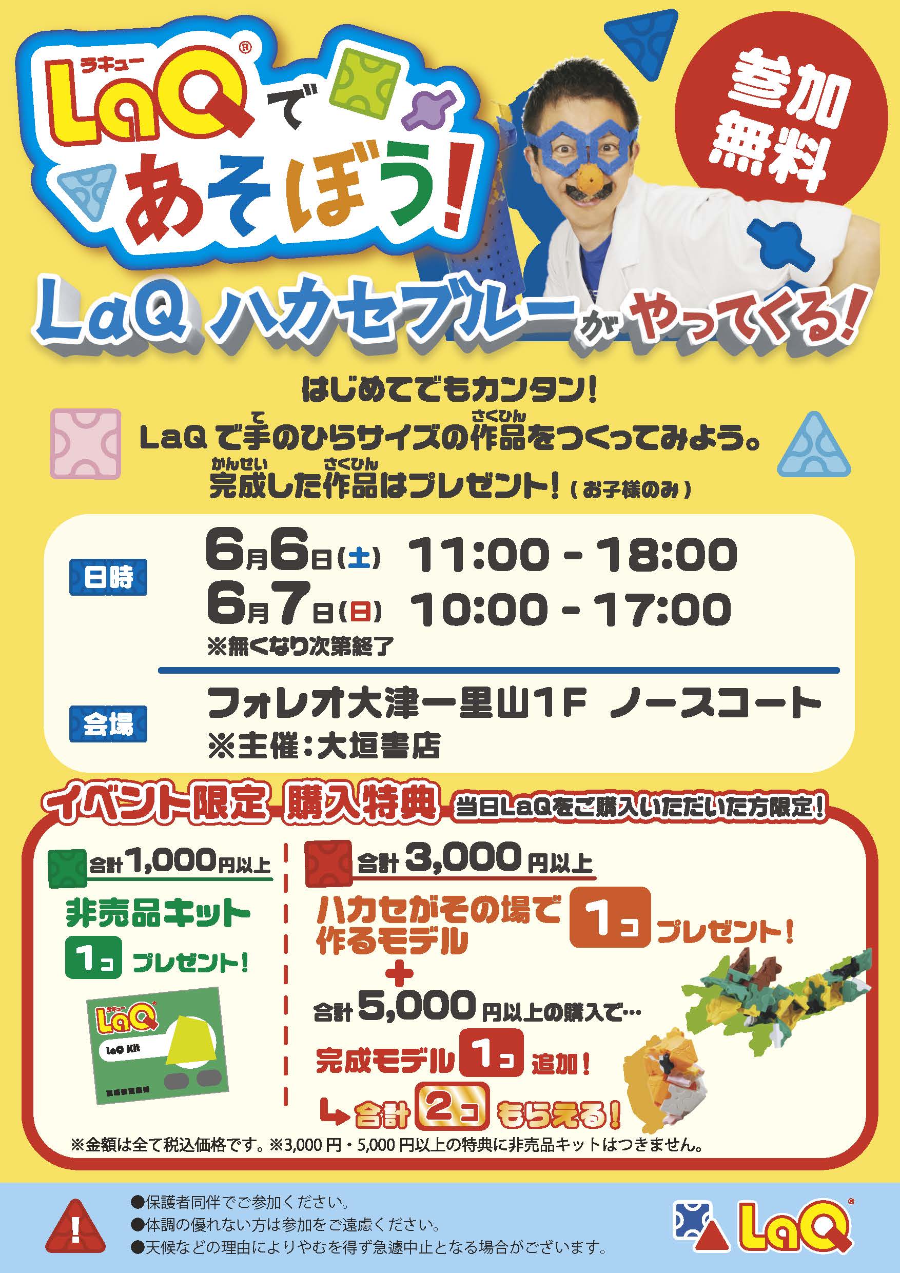 2026年4月7日はじめてでもカンタン!LaQで手のひらサイズの作品を作ってみよう。完成した作品はプレゼント!ハカセブルーがやってきます!!